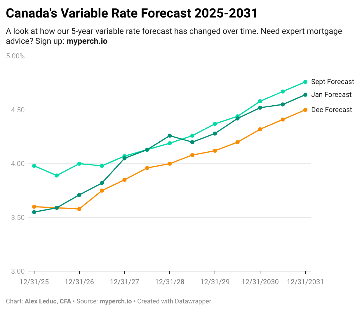 In the chart below, you can see how our 5-year variable rate forecast has changed over time based on the Bank of Canada’s interest rate announcements. (Like what you see? Sign up to get free, personalized mortgage insights and our monthly mortgage outlook!)