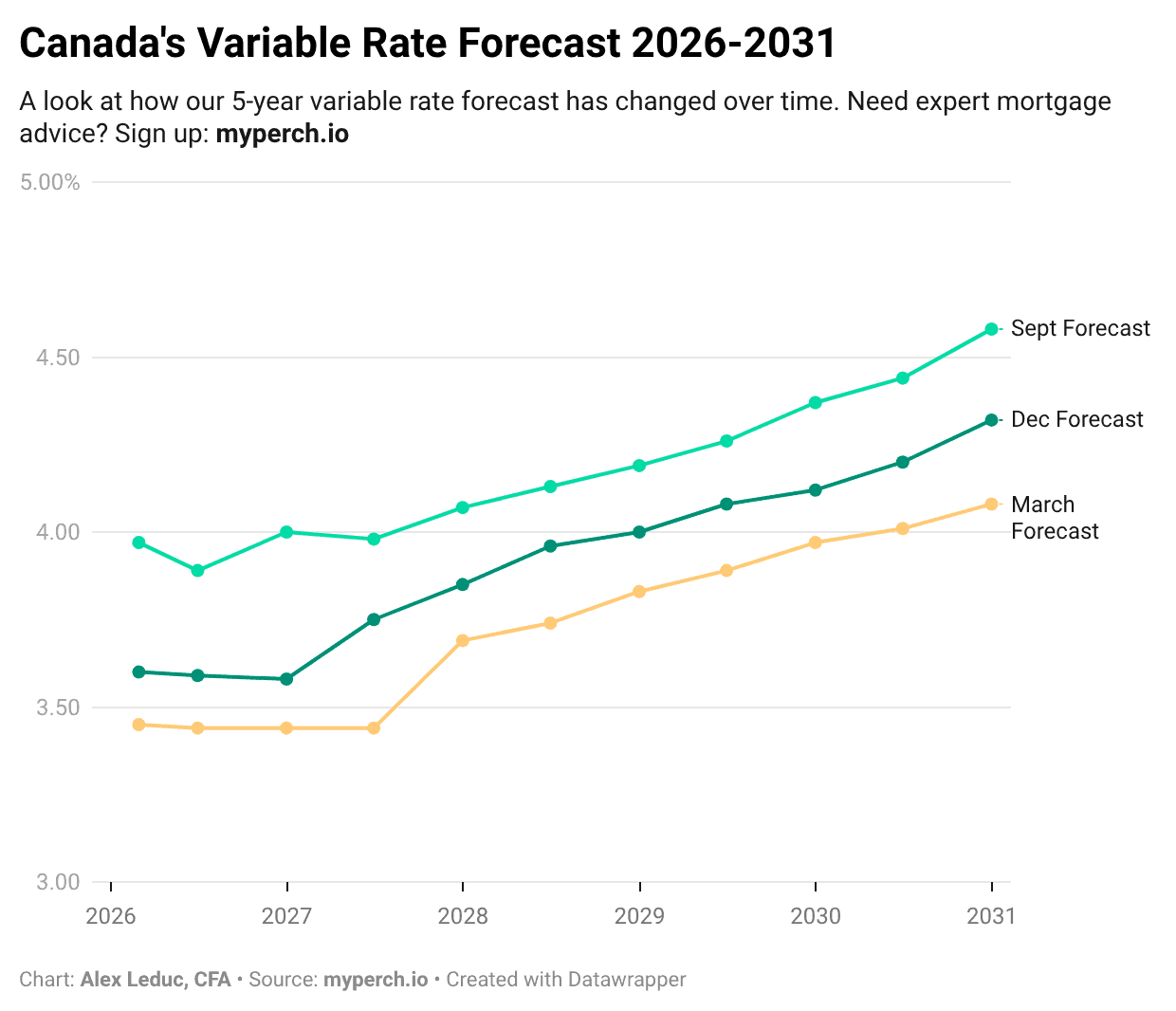 In the chart below, you can see how our 5-year variable rate forecast has changed over time based on the Bank of Canada’s interest rate announcements. (Like what you see? Sign up to get free, personalized mortgage insights and our monthly mortgage outlook!)